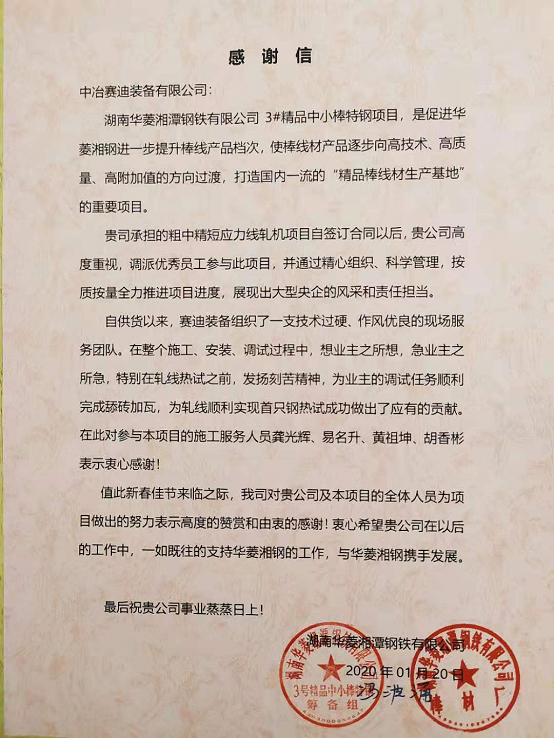 此項(xiàng)目從簽訂合同以來,賽迪裝備積極應(yīng)對,精心組織,全力配合業(yè)主現(xiàn)場生產(chǎn)計(jì)劃,截止到2019年12月26日,該項(xiàng)目在線和備件共42臺套軋機(jī)全部運(yùn)抵現(xiàn)場,陸續(xù)安裝、調(diào)試并一次性熱試成功,最終受到業(yè)主的好評,并專程發(fā)來了感謝信。