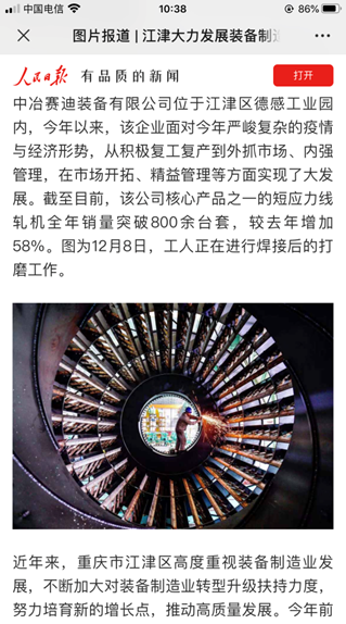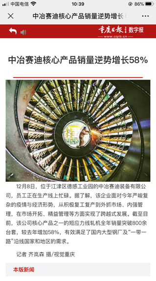 面對公司良好的發(fā)展勢頭,各路媒體紛至沓來,爭相報道。重慶衛(wèi)視新聞聯(lián)播以《中冶賽迪:技術(shù)創(chuàng)新推動數(shù)字化轉(zhuǎn)型》為題,著重報道了賽迪裝備“產(chǎn)品化”和科技創(chuàng)新成果;人民日報以《江津大力發(fā)展裝備制造業(yè),助推高質(zhì)量發(fā)展》為題,重點介紹了賽迪裝備在精益管理、市場開拓上的重大突破;重慶日報也推出《中冶賽迪核心產(chǎn)品逆勢增長58%》的報道,展現(xiàn)賽迪裝備在今年復雜形勢下實現(xiàn)的跨越式發(fā)展。,