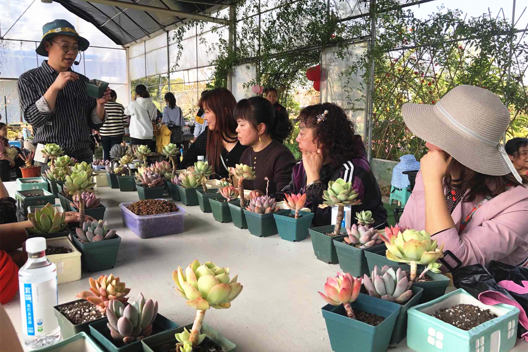活動(dòng)伊始,段昌敏代表工會(huì)女工委員會(huì)向在場女性同胞們送上了節(jié)日祝福,并組織大家參觀了多肉植物園。隨后,多肉植物園園主為女職工們科普多肉植物,并講授如何培養(yǎng)多肉,期間的有獎(jiǎng)競答將活動(dòng)引入了高潮。在進(jìn)行別具一格的多肉植物DIY時(shí),大家圍坐在一起,在園主的講解和指導(dǎo)下,饒有興趣的開始栽種。剖土、栽種、鋪面、美化……一盆盆“小巧呆萌”的組合多肉呈現(xiàn)在眼前。大家都樂在其中,一會(huì)兒談笑風(fēng)生,一會(huì)兒相互協(xié)助、拍照留念,讓活動(dòng)在愉快的氛圍中有序開展。