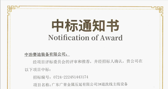 7月25日,中冶賽迪裝備接到廣青金屬壓延有限公司中標(biāo)通知書,由賽迪股份、賽迪裝備共同開(kāi)拓的廣東廣青金屬壓延3#不銹鋼退火酸洗主線設(shè)備成套項(xiàng)目成功中標(biāo)。