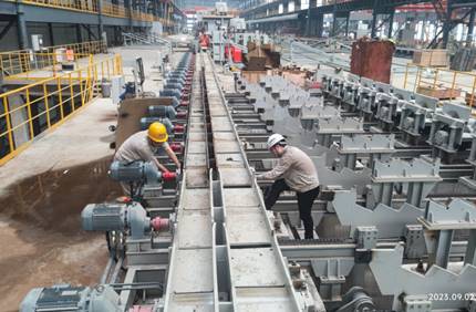 生產(chǎn)線(xiàn)靠前的連軋區(qū)域因賽迪裝備成熟而豐富的工程經(jīng)驗(yàn)進(jìn)展很順利,各項(xiàng)指標(biāo)均達(dá)到設(shè)計(jì)要求。然而9月18日臨近熱試節(jié)點(diǎn)時(shí),采用新工藝的編組區(qū)與冷床區(qū)因小問(wèn)題疊加,調(diào)試時(shí)液壓缸損壞出現(xiàn)了漏油情況。為了確保20日的熱試節(jié)點(diǎn)“后墻不倒”,張程霖、周德洪、程江、夏棋、高陽(yáng)5名設(shè)計(jì)當(dāng)天連夜收集現(xiàn)場(chǎng)流體液壓參數(shù)和應(yīng)用數(shù)據(jù),在沒(méi)有經(jīng)驗(yàn)可循的情況下逐個(gè)進(jìn)行分析、驗(yàn)證,加班加點(diǎn)制定出2套備用整改方案。19日,團(tuán)隊(duì)10余人擰成一股繩,在臨時(shí)黨支部書(shū)記、項(xiàng)目經(jīng)理趙遠(yuǎn)峰帶領(lǐng)下,黨員同志董立蘇、張程霖、高陽(yáng)、張子念、周德洪等人充分發(fā)輝先鋒模范作用,帶頭逐一復(fù)核尺寸、校對(duì)液壓參數(shù),期間累了,就和著紙板鋪地上簡(jiǎn)單休息一下,午餐晚餐也是匆匆扒幾口盒飯繼續(xù)投入戰(zhàn)斗。最終在“早八對(duì)早八“的通宵達(dá)旦拼搶下,編組與冷床區(qū)具備了熱試條件,于20日晚一次性熱負(fù)荷試車(chē)成功。