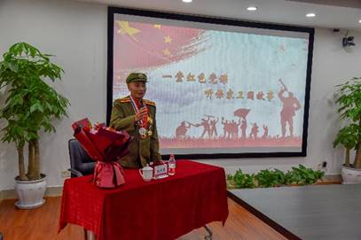 在專題黨課開始前,全體黨員觀看了中印邊境自衛(wèi)反擊戰(zhàn)網(wǎng)絡視頻,黨委組織部副部長張昆對老英雄的事跡進行了簡要介紹,張甲剛代表黨政向老英雄送花,并致歡迎詞。