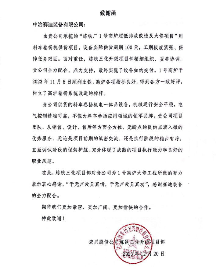 致謝函對賽迪裝備為1號高爐大修工程所做的努力表示衷心感謝,并期待雙方更加親密、更加廣闊、更加愉快的合作。