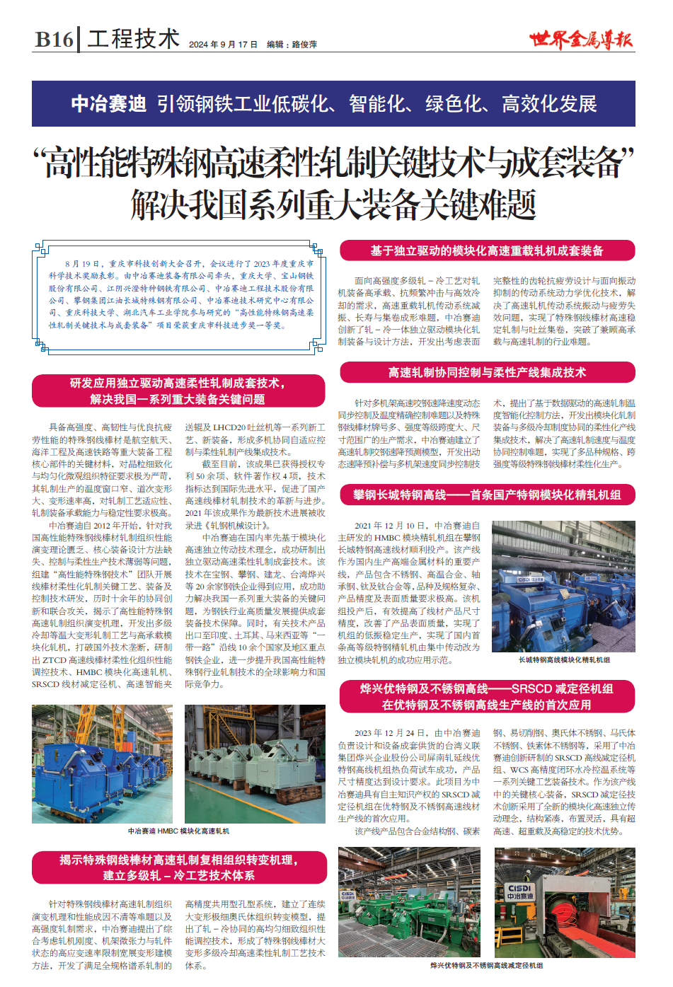 9月17日,《世界金屬導(dǎo)報》以“‘高性能特殊鋼高速柔性軋制關(guān)鍵技術(shù)與成套裝備’解決我國系列重大裝備關(guān)鍵難題”為題,專版報道近日榮獲重慶市科技進步獎一等獎的中冶賽迪“高性能特殊鋼高速柔性軋制關(guān)鍵技術(shù)與成套裝備”。