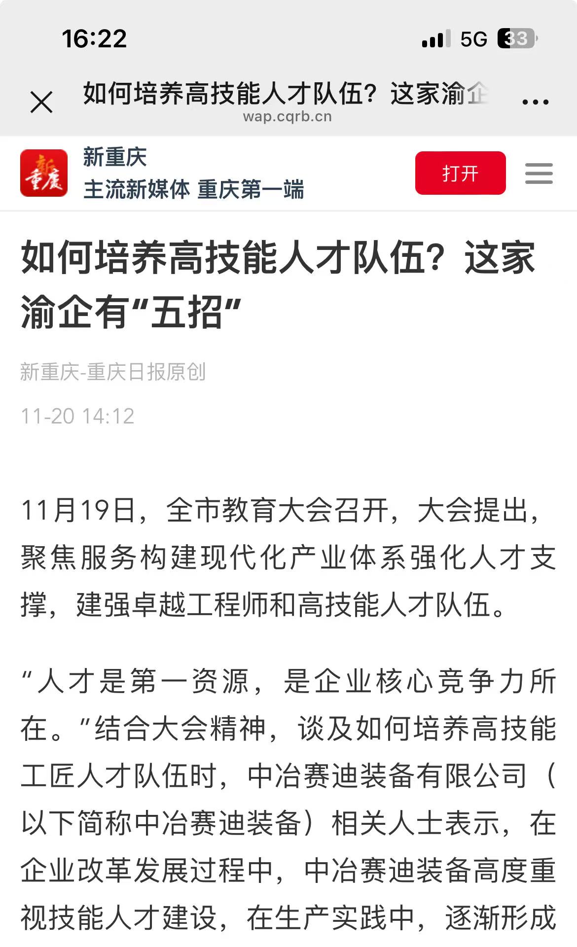11月19日,全市教育大會召開,大會提出,聚焦服務構建現(xiàn)代化產業(yè)體系強化人才支撐,建強卓越工程師和高技能人才隊伍。 11月20日,新重慶-重慶日報以“如何培養(yǎng)高技能人才隊伍?這家渝企有‘五招’”為題,報道中冶賽迪裝備在技能人才建設中的經(jīng)驗做法。
