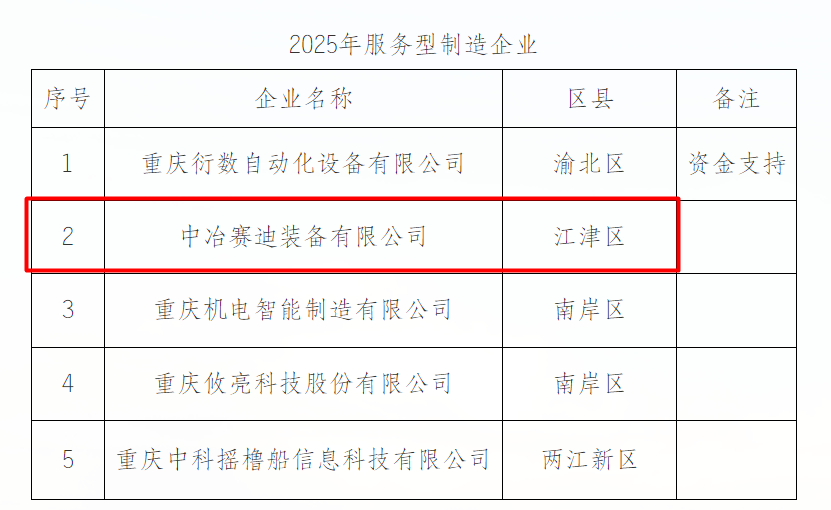 8月11日,中冶賽迪裝備申報的"綠色冶金與高端裝備服務型制造企業(yè)"通過重慶市經濟和信息化委員會審批,成功入選重慶市2025年服務型制造企業(yè),這標志著中冶賽迪裝備在科技創(chuàng)新、研發(fā)中試、制造型服務業(yè)建設以及引領行業(yè)產業(yè)轉型升級方面,取得階段性成果。